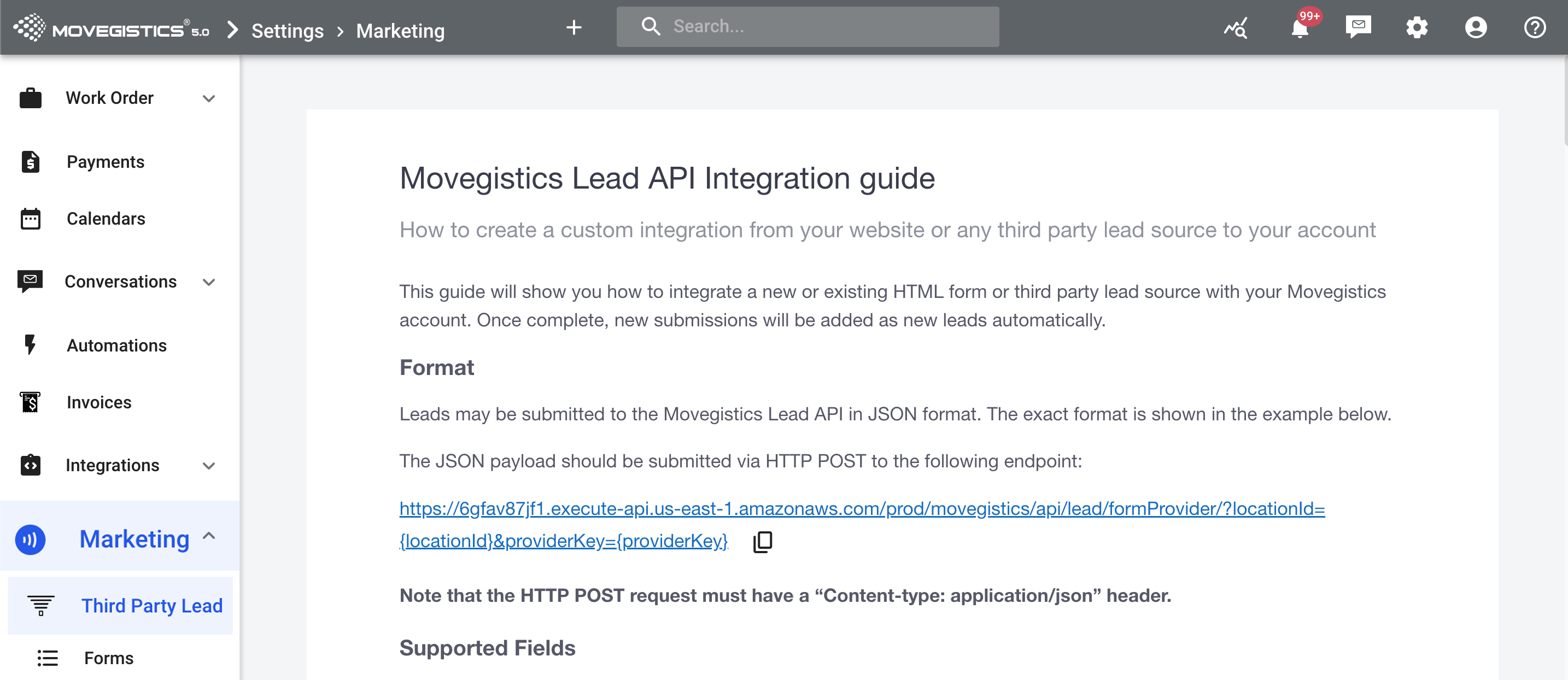 API setup instructions under Settings > Marketing > Third Party Leads