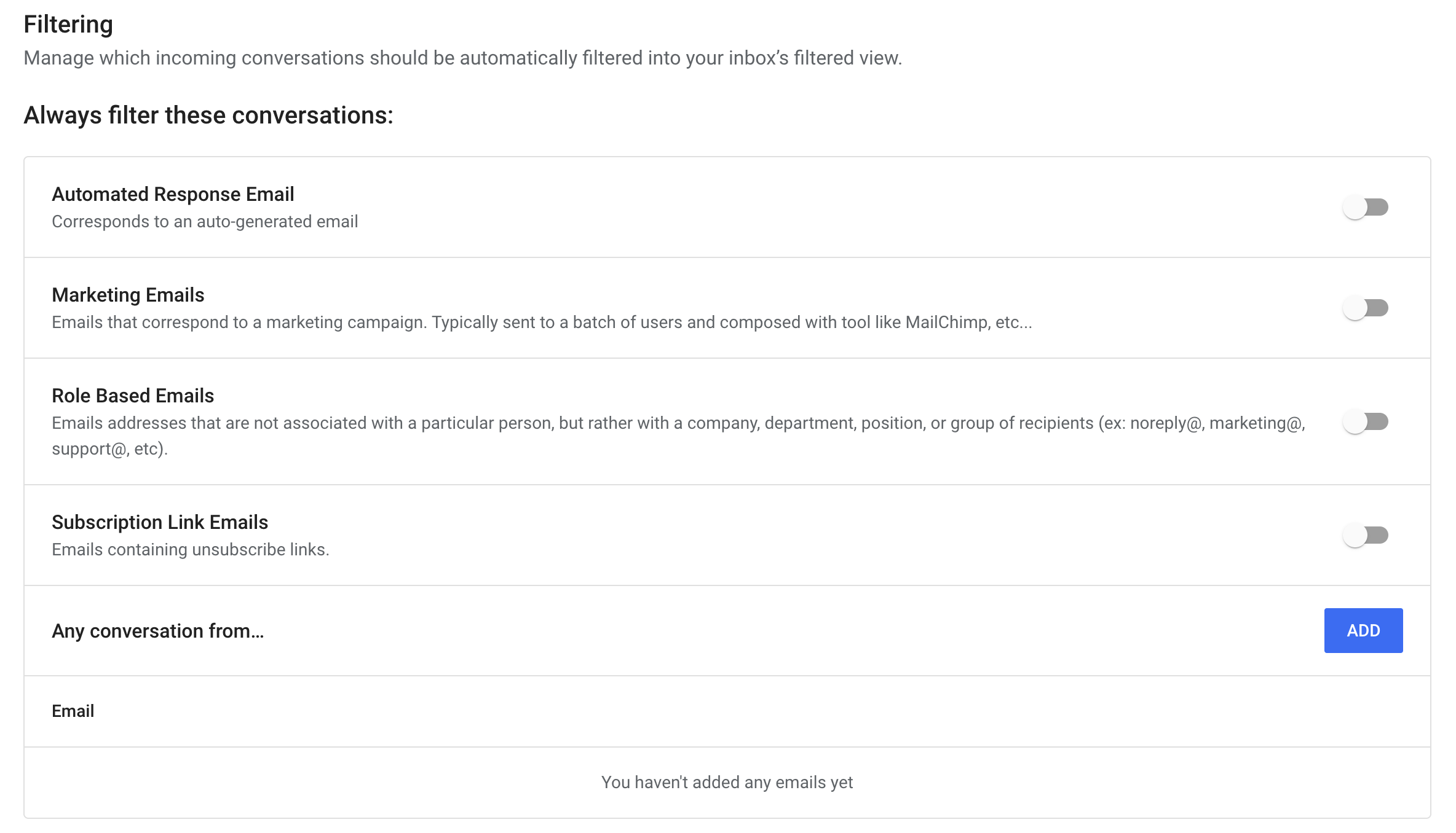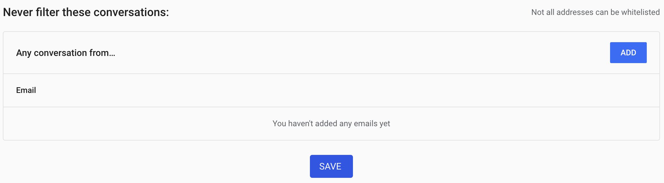 Whitelist emails under "Never filter these conversations"