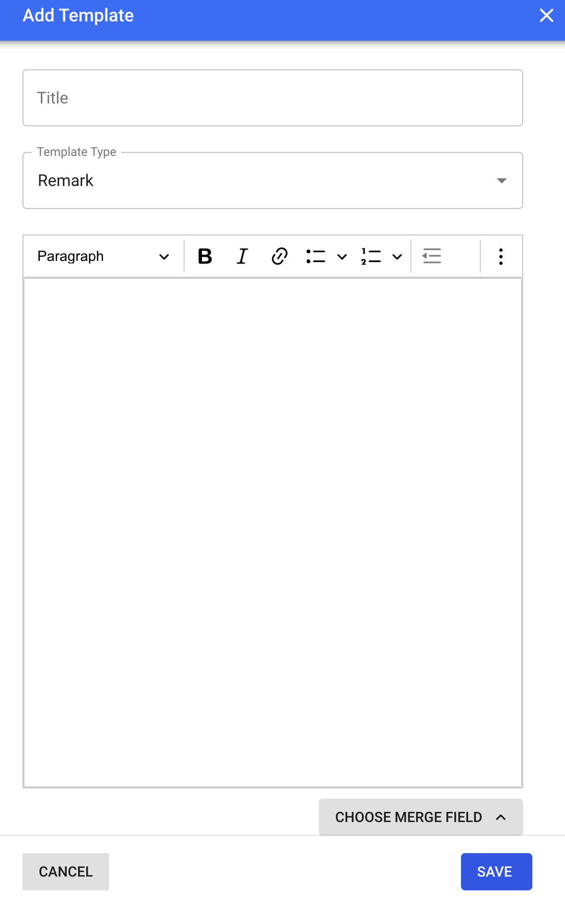 Content: Add your remark and use merge fields such as