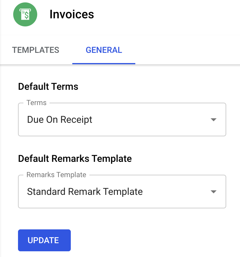 Default Remarks Template: Select a prebuilt remark to auto-apply to all new invoices.