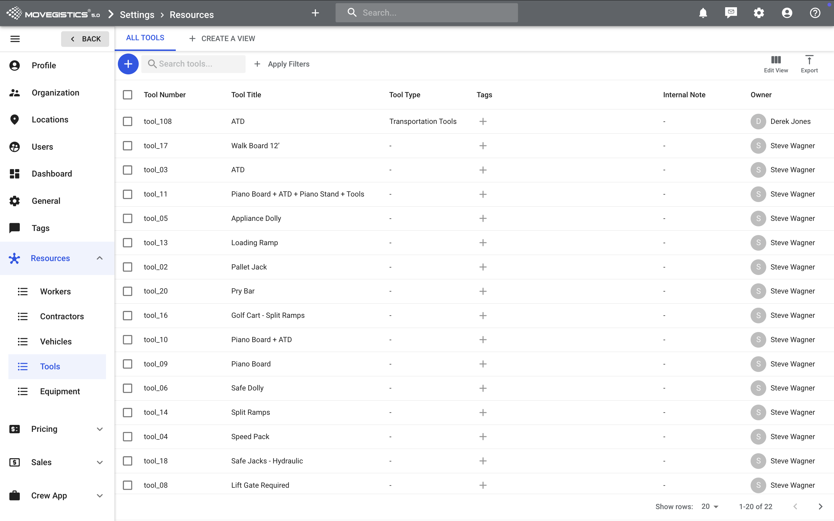 Properly managing the tools your crews rely on is essential to smooth operations, accurate dispatching, and equipment accountability. With Movegistics 5.0, the Tools Settings under the Resources module give you the ability to document, categorize, and organize all moving equipment—from dollies to ramps and liftgates—ensuring your field teams are always equipped and your asset records are always up to date.