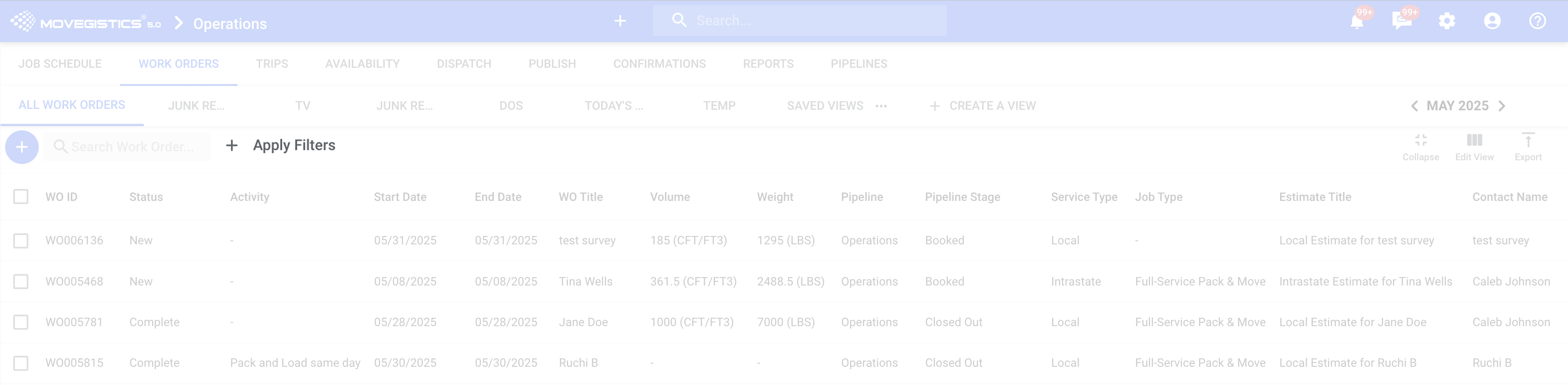 From this screen, you can export, customize views, and review historical or upcoming jobs at a glance.