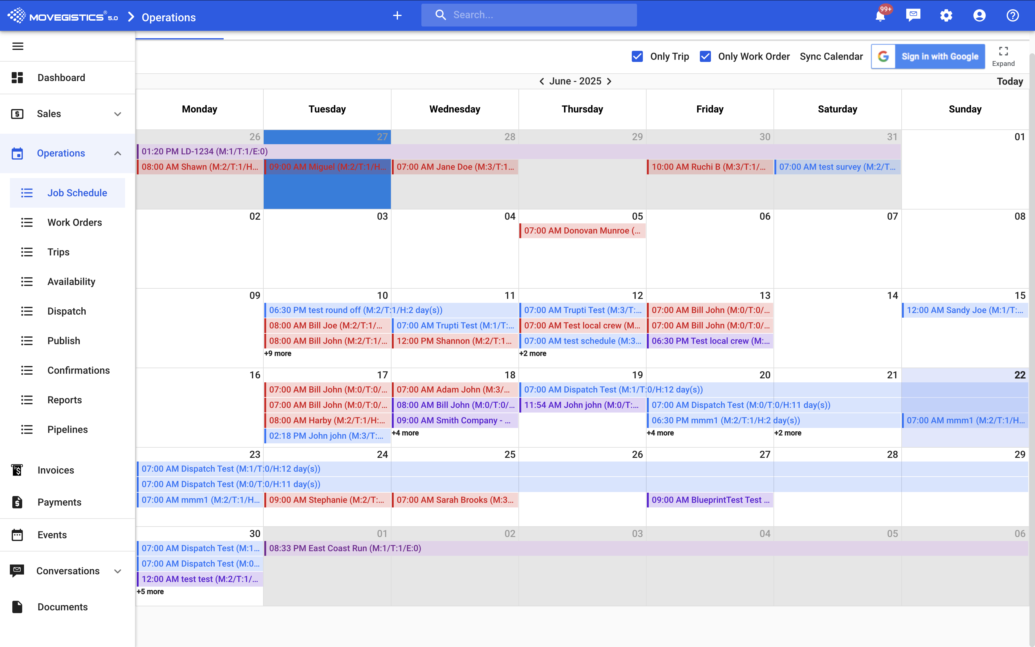 The Job Schedule is your operations command center. It shows all Work Orders and Trips currently scheduled—color-coded and fully interactive.