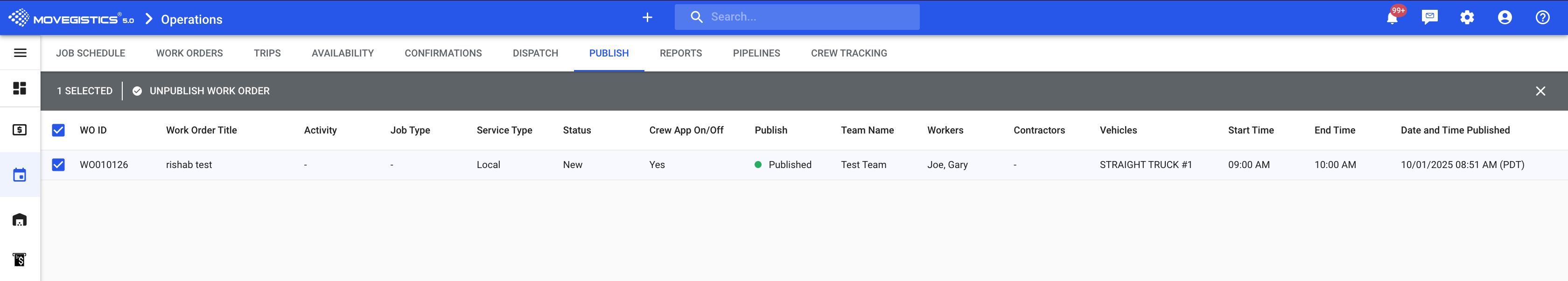 Publishing a job makes it visible and accessible to the assigned crew in the Crew App. Until a job is published, it remains in a draft state—even if workers and trucks are already assigned.