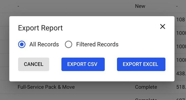 Each report row includes export functionality: