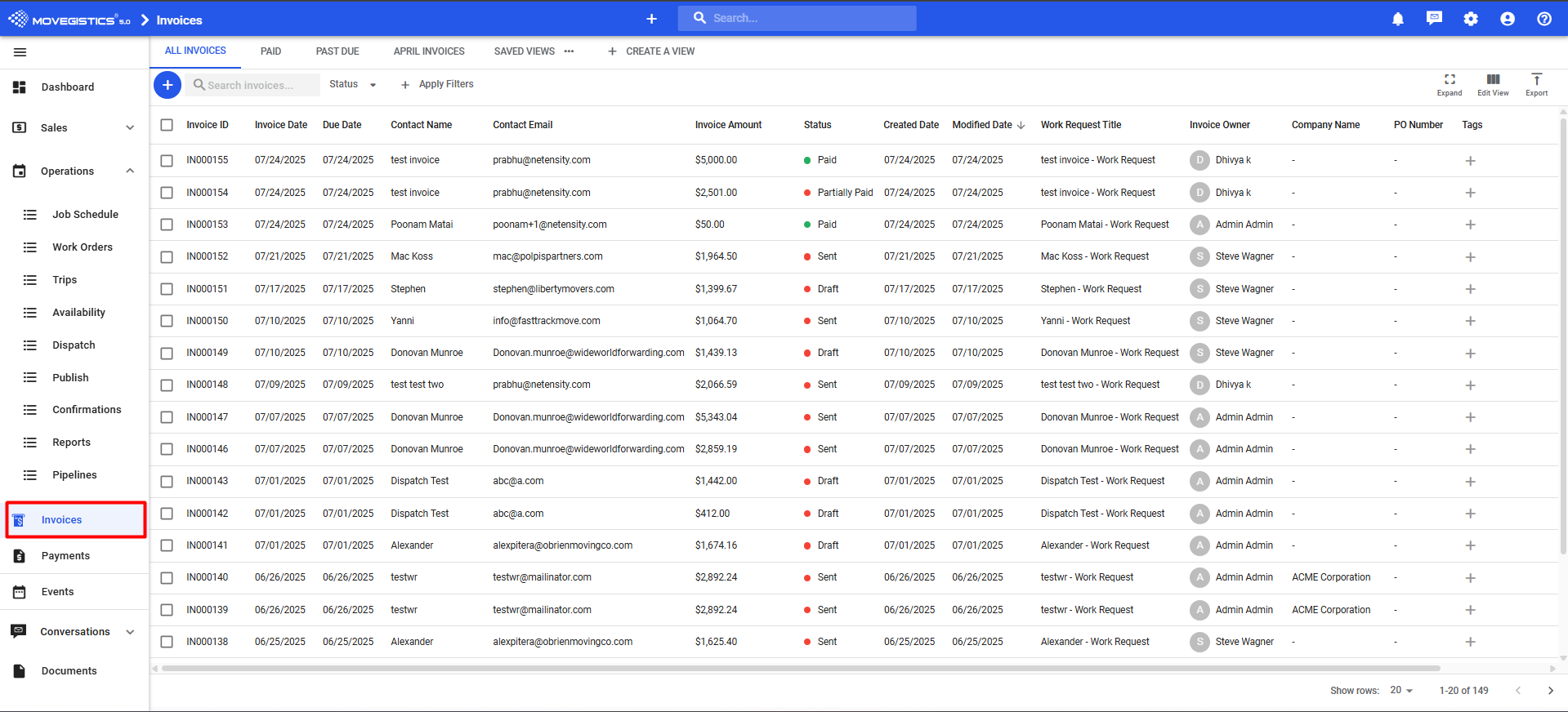 The Invoices tab under the Main Menu provides full access to your billing records across every department in your organization. Whether you're in Sales, Operations, or Finance, this unified view helps ensure: