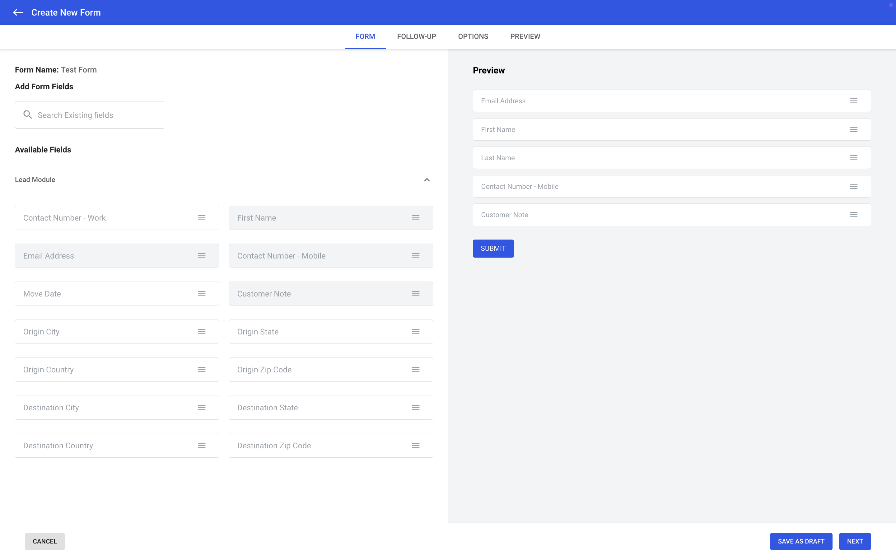 Popular fields include: First Name, Email, Mobile Number, Move Date, Origin and Destination Info.