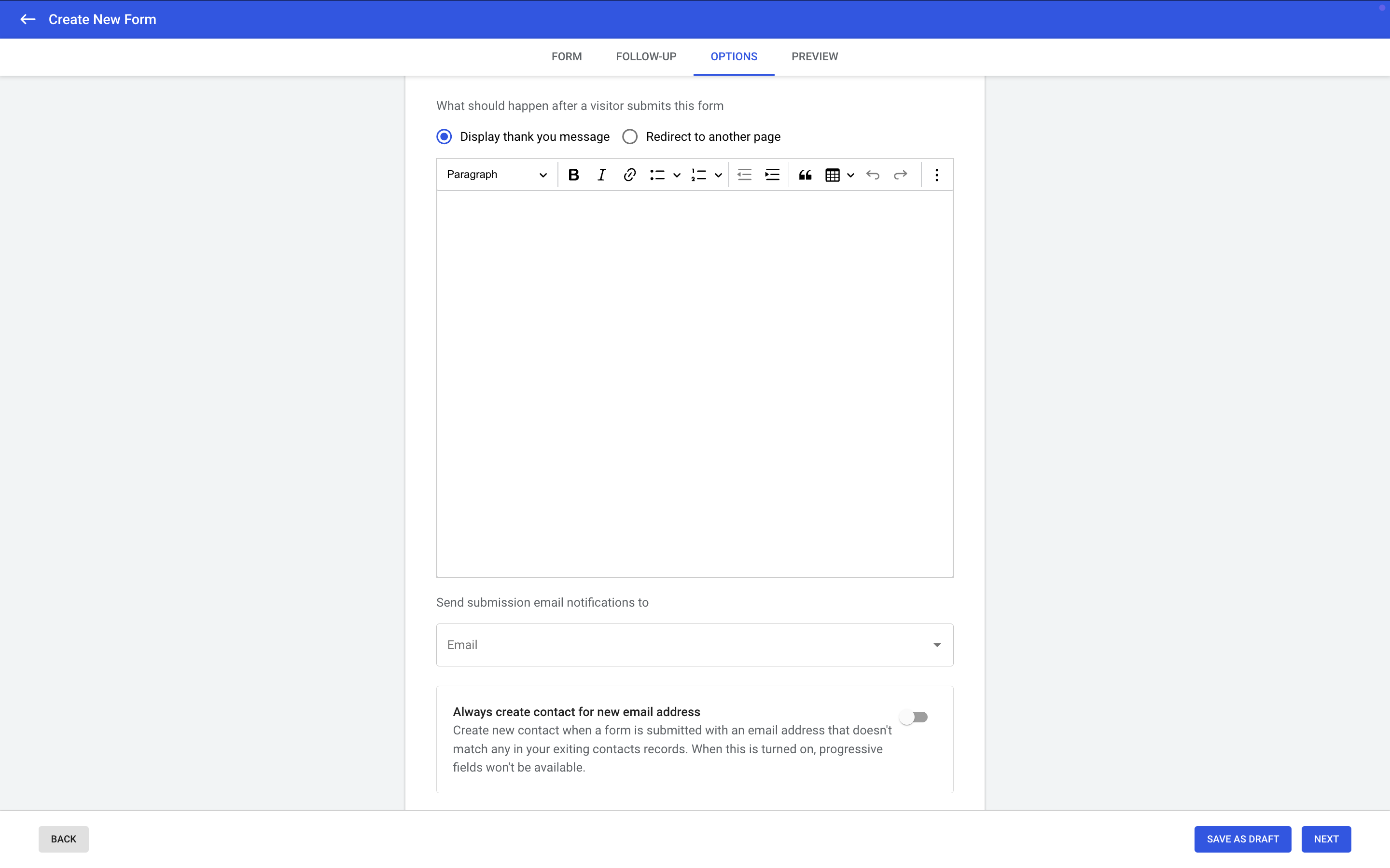 Under the Options tab, choose what happens after form submission: